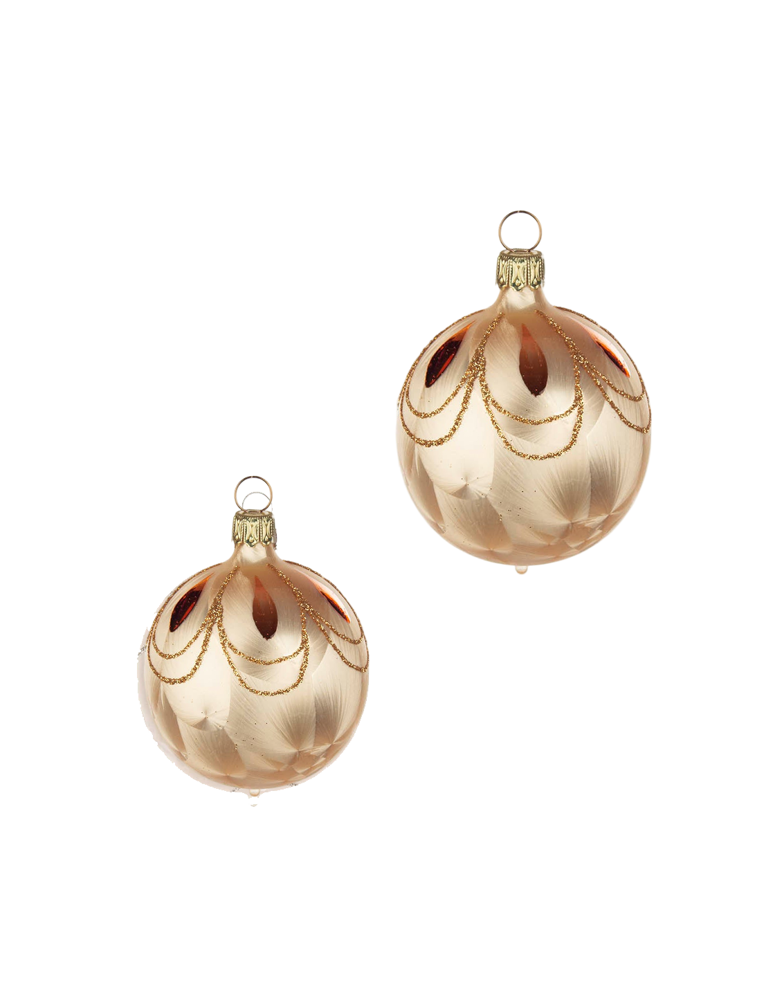 Each ornament is mouth-blown from fine glass, silvered within for depth, and hand-glittered in warm copper tones. Its understated shimmer and golden glow bring quiet sophistication to the tree—an elegant expression of German artistry and timeless holiday tradition.