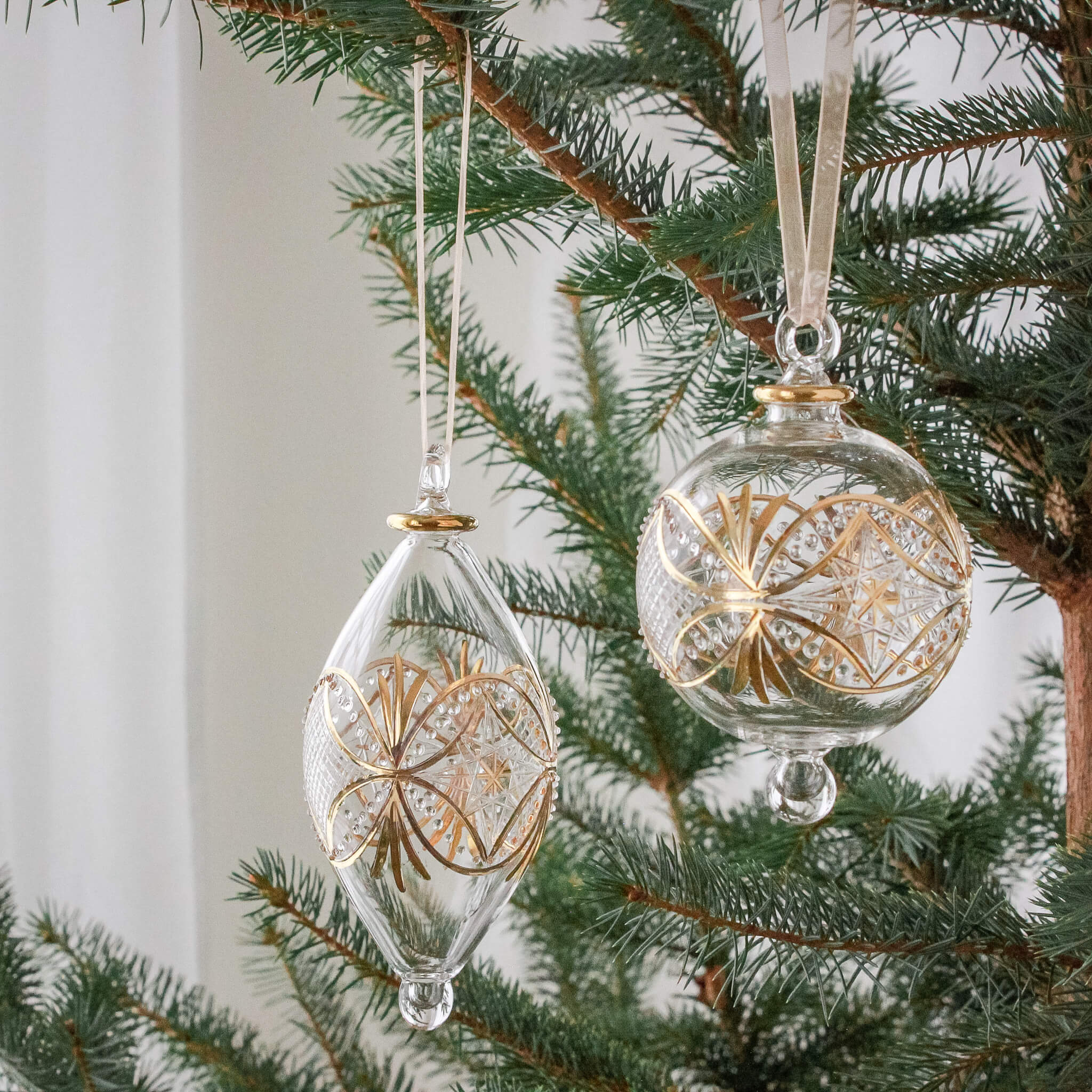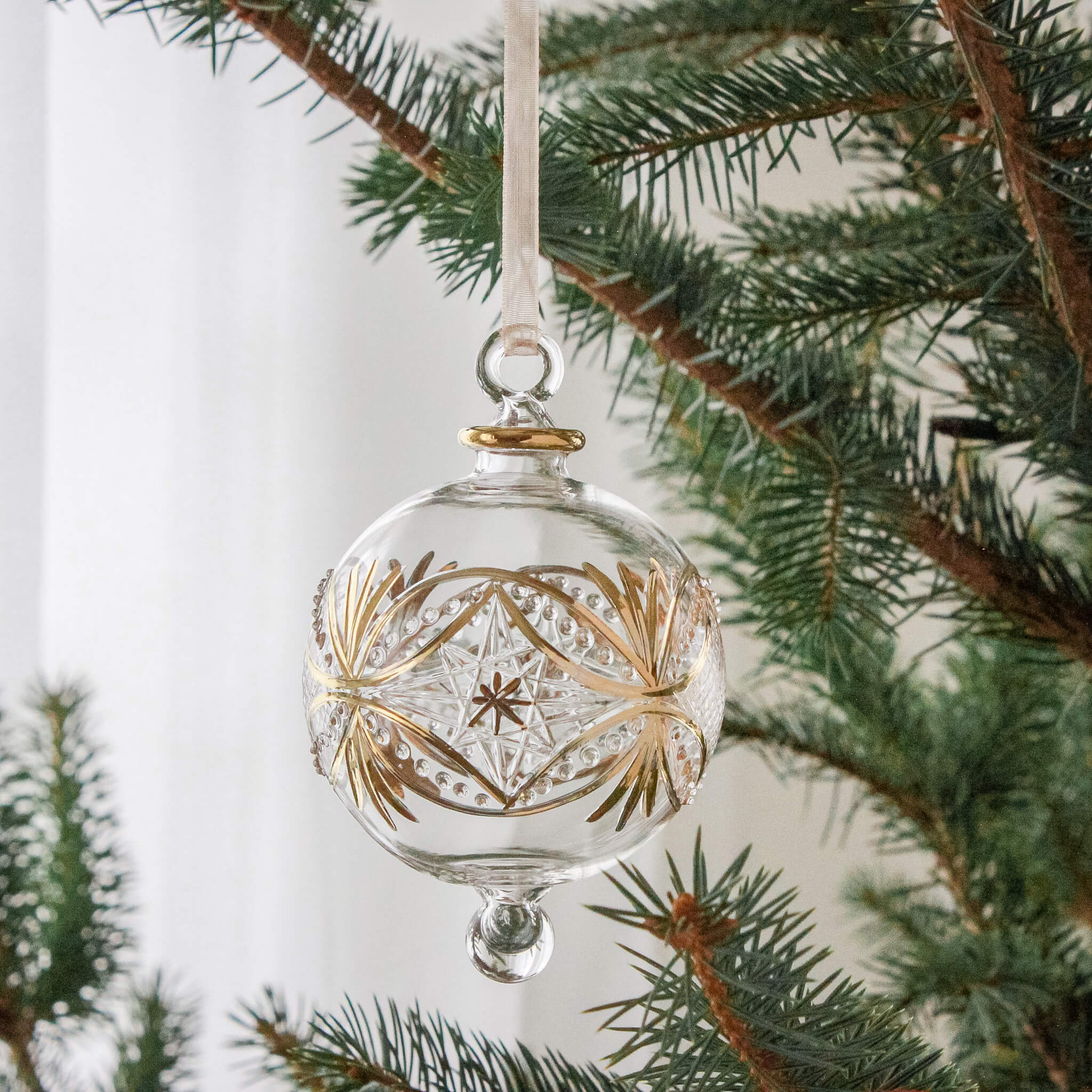 A study in intricate craftsmanship, our Gold Garland ornament features clear glass with richly detailed gold garlands painted by hand.