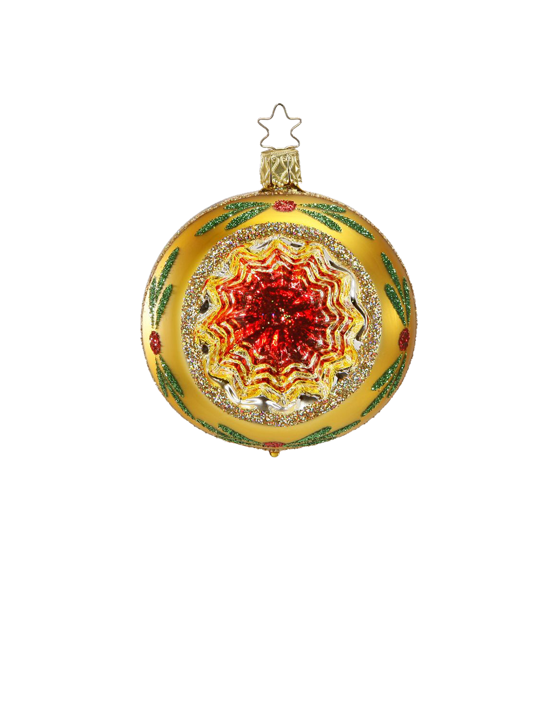 The Holly Reflector Ornament is a celebration of classic German artistry. Each ornament is mouth-blown from glass, dipped in genuine sterling silver, and carefully hand painted in rich hues of red, green, and gold. Its vintage-style reflector center gleams softly under twinkling lights, bordered by a fine rim of hand-applied gold glitter.