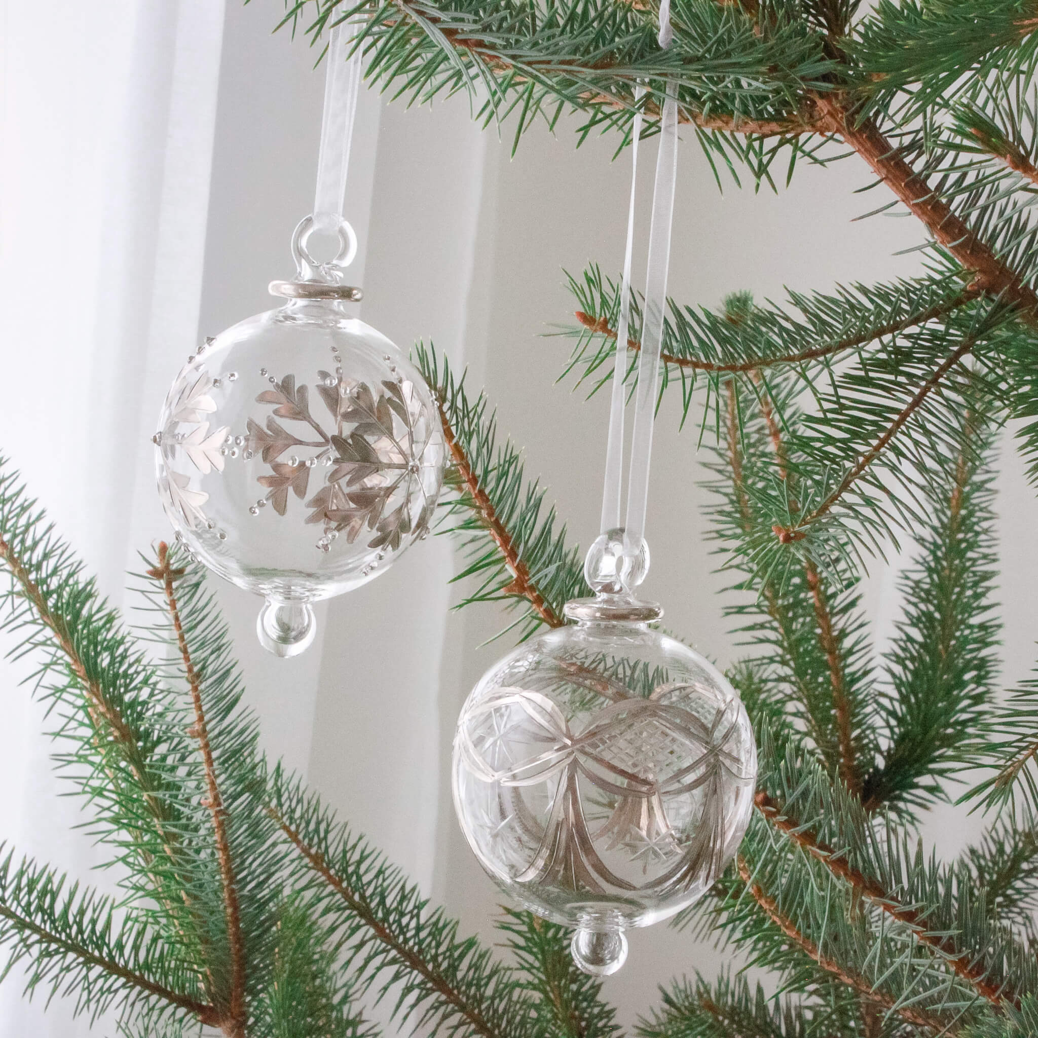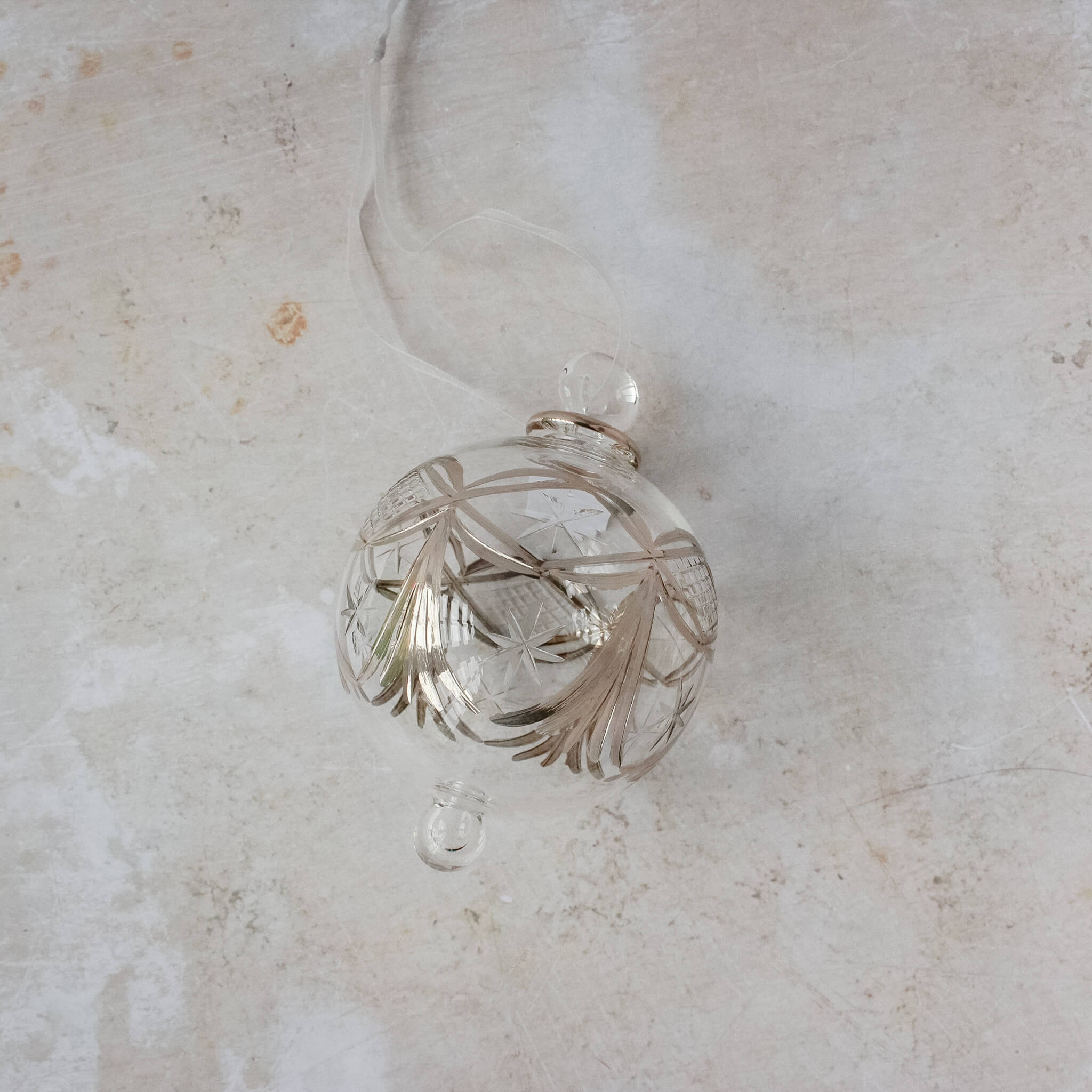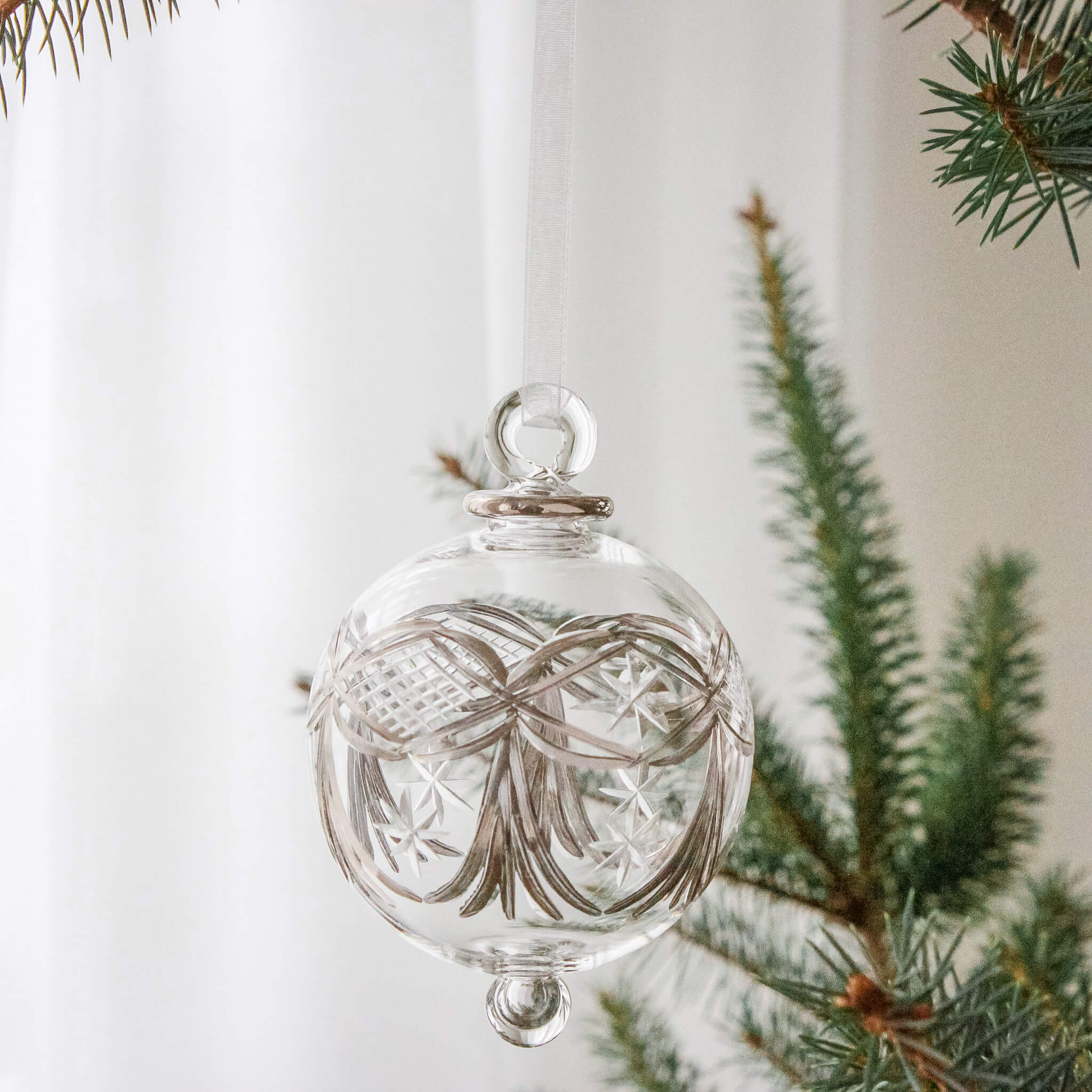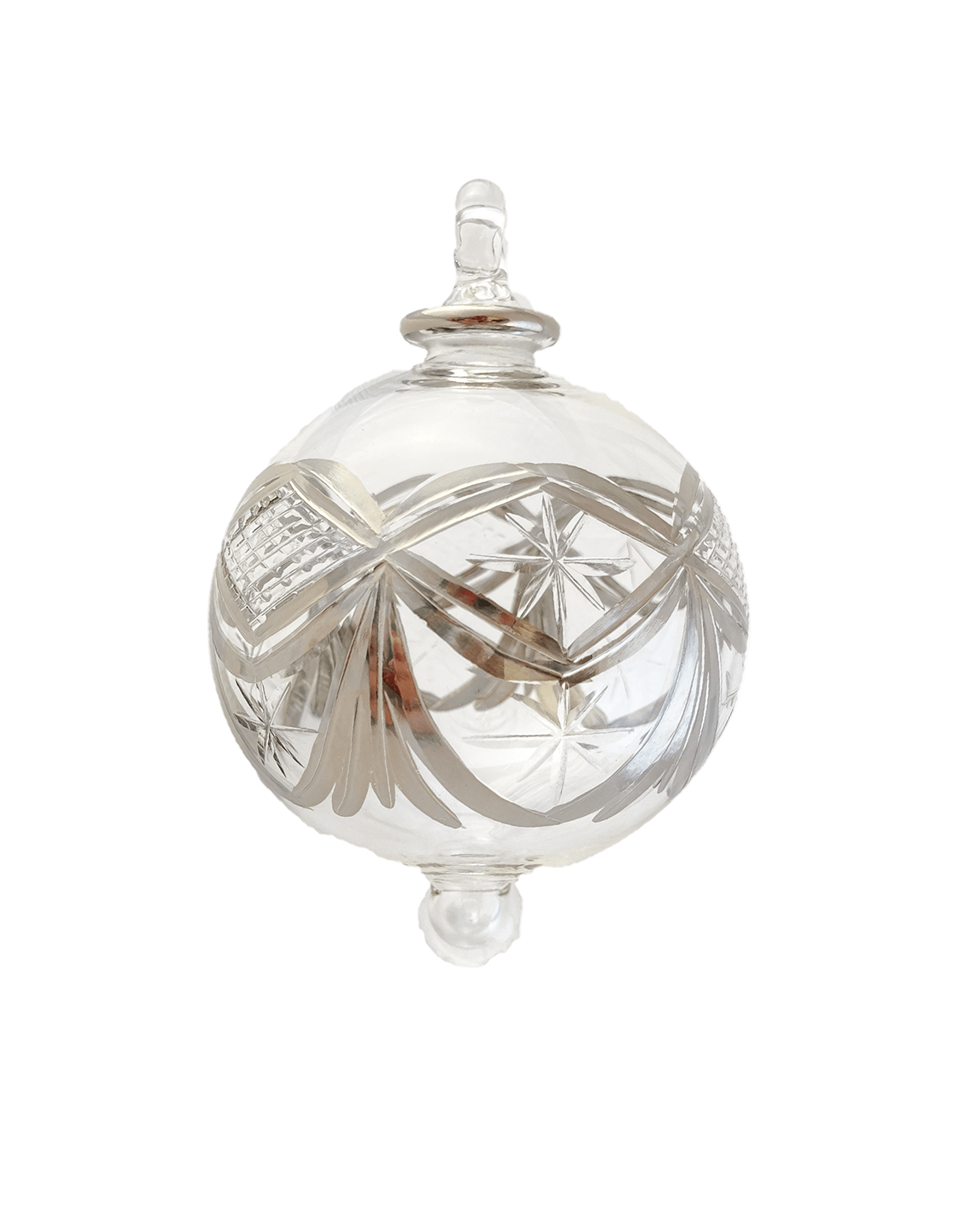 A study in intricate craftsmanship, our Silver Garland ornament features clear glass with richly detailed gold garlands painted by hand.