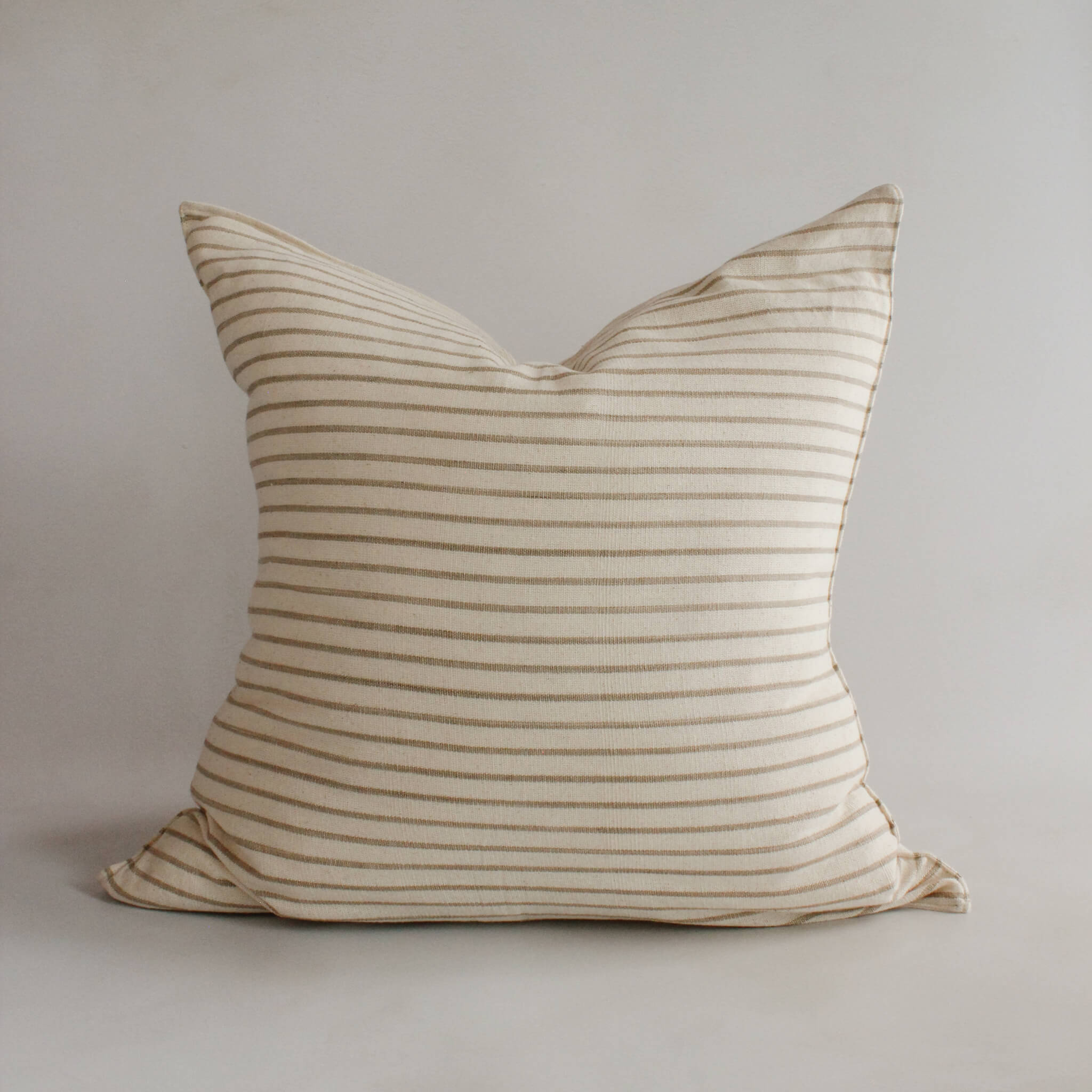 The Greige Stripe pillow is a decorative throw cushion cover that features a classic pinstripe fabric in handwoven cotton.