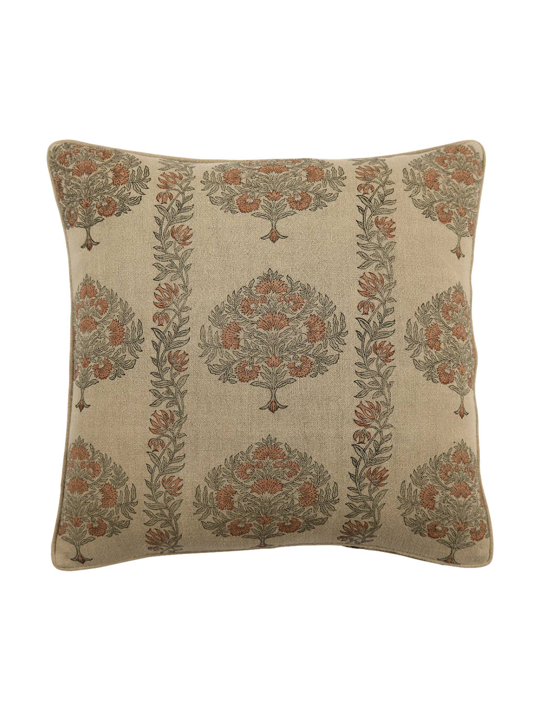 The Mour Coral features flowering trees and climbing florals in quiet tones of terracotta, moss, and charcoal. Each cover is carefully block printed by skilled artisans, meaning no two are exactly alike.