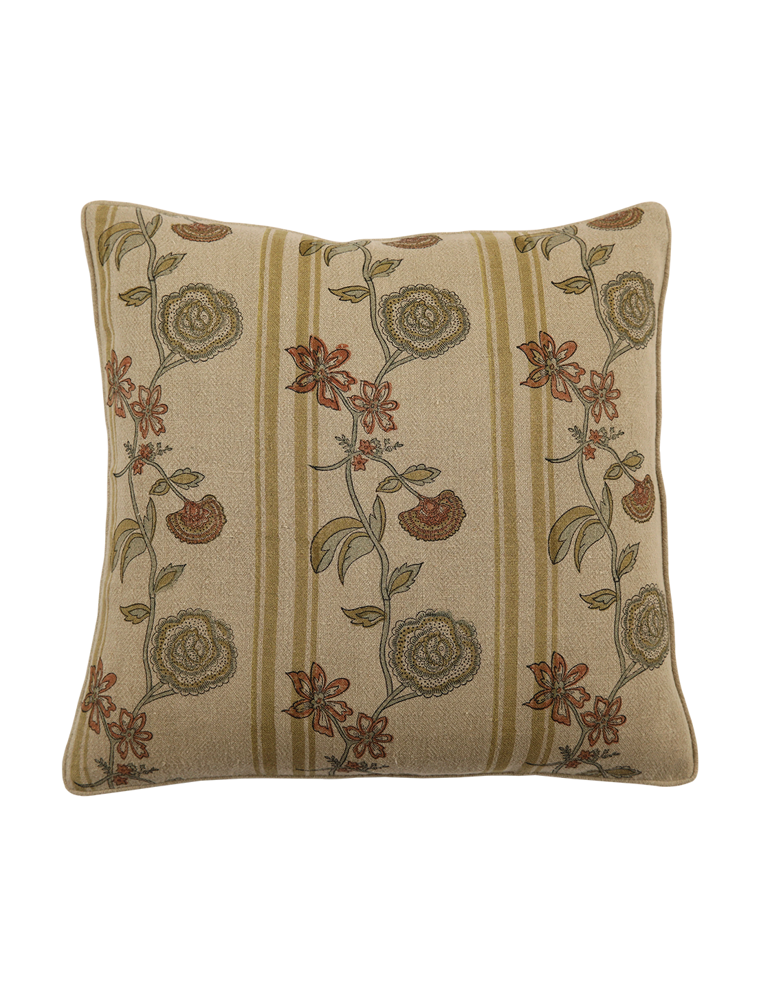 The Ora Saffron cushion cover brings warmth and whimsy to your home. Hand-loomed from 100% natural linen and block printed using age-old techniques, the cover features delicate floral tendrils in soft saffron, coral, and sage—balanced by golden stripe accents.