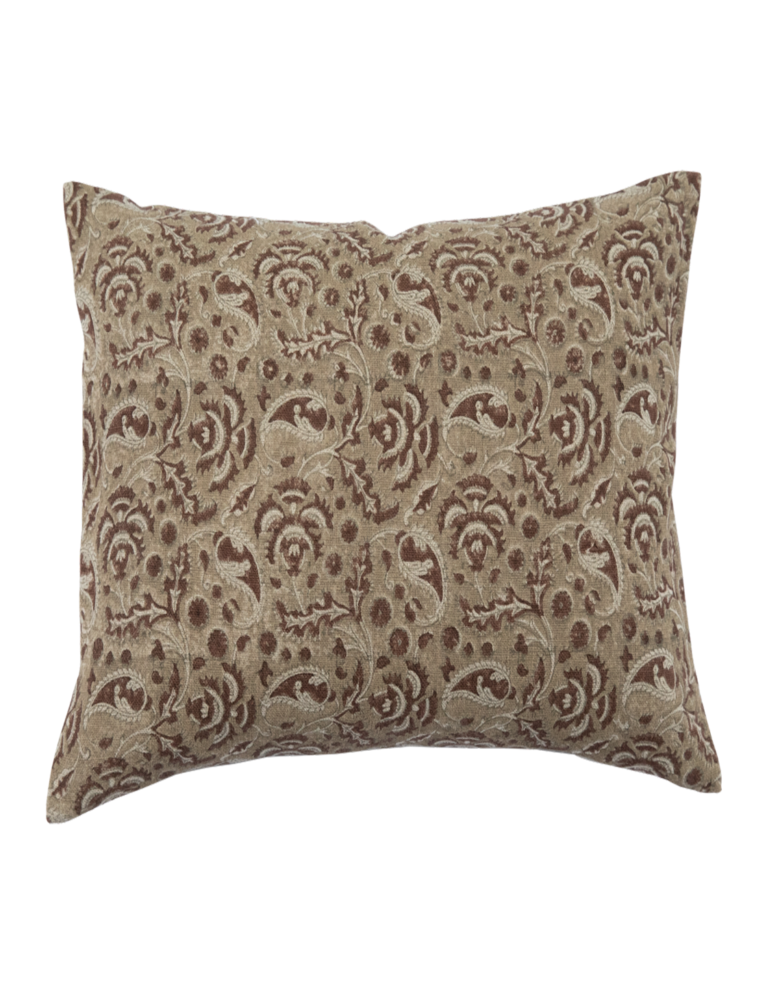 Rooted in rich earth tones and intricate tradition, the Bari cushion cover adds quiet depth to any space. Woven from 100% hand-loomed linen and finished with a delicate block-printed floral repeat, its warm brown hue is both grounding and elegant.