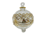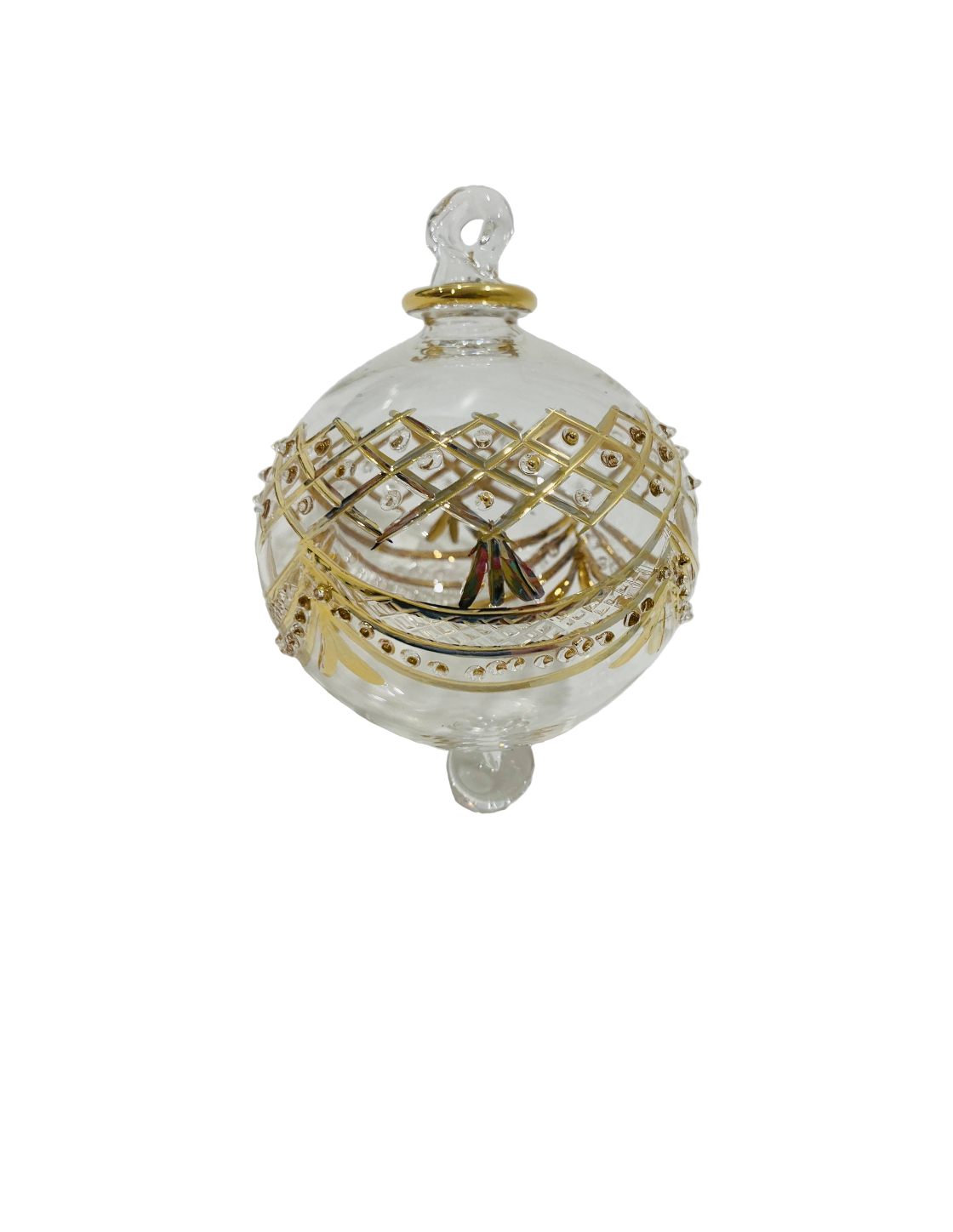 Hand-blown by Fair Trade artisans in Old Cairo, the Baroque Garland Gold ornament shimmers with timeless beauty. Its clear glass surface is traced with hand-painted gold garlands, capturing the glow of candlelight and celebration.