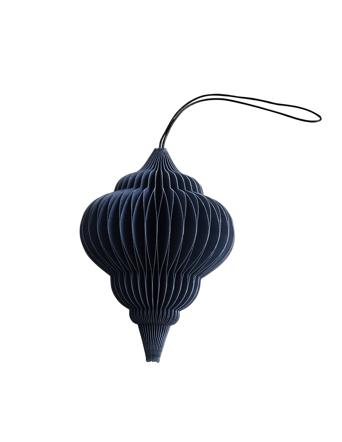 Sculptural in form, this jewel-shaped ornament is handmade from Katran, a sturdy, paper-like material created by upcycling cotton fabric waste. Its deep midnight hue and soft texture bring a sense of calm sophistication to the tree. Finished with a Musa bio-leather string made from banana fiber and wool, and secured with a hidden magnet, it folds flat for easy storage and opens beautifully year after year—a simple, enduring piece crafted with care.