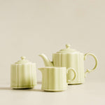 Inspired by the charm of England’s elegant afternoon teas, this cream and sugar set pairs a timeless silhouette with sculpted details and the refined craftsmanship of Japanese porcelain. Its gentle curves, glossy green glaze, and dainty scale bring a touch of old-world elegance to any tea ritual.