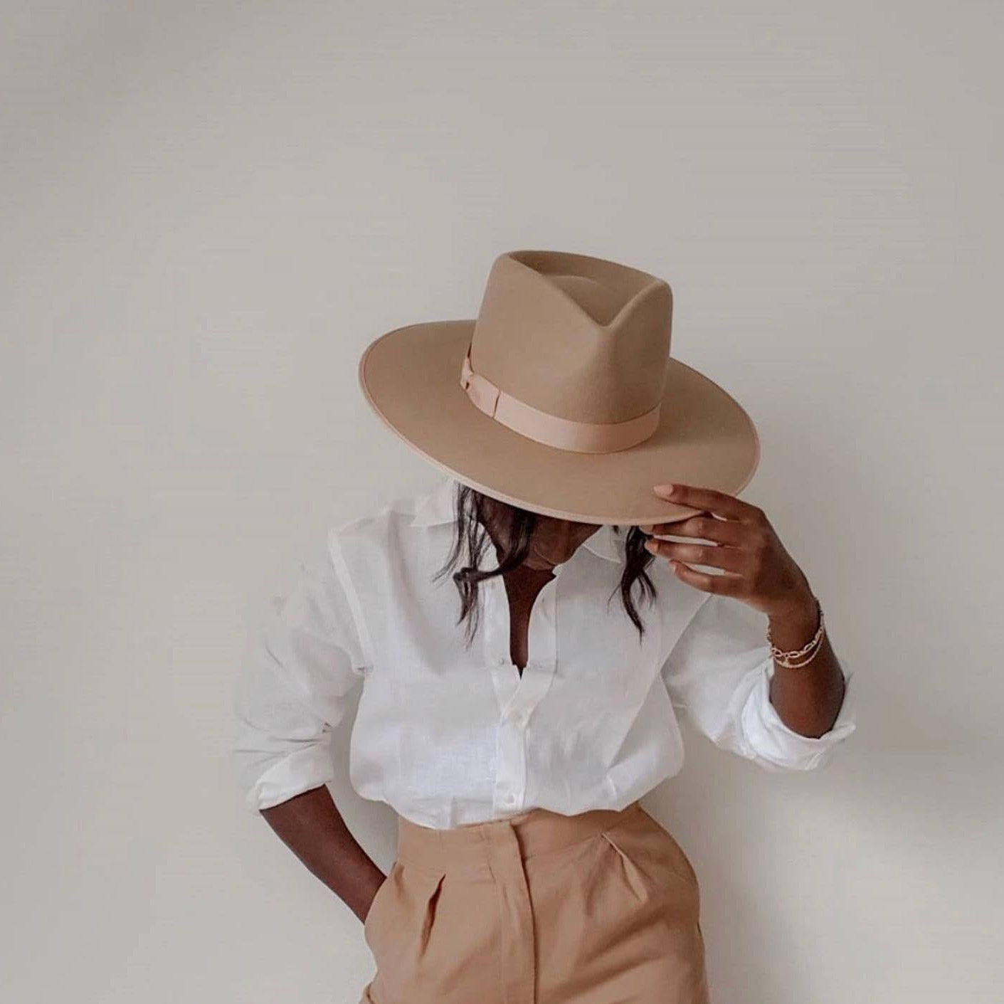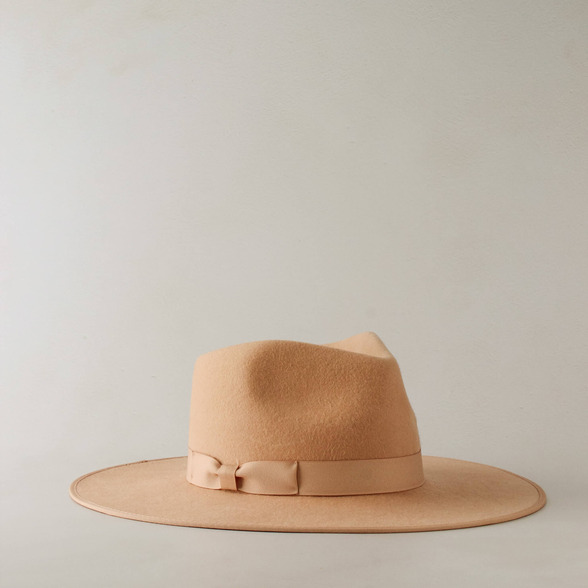 A stiffened wool fedora with a rigid crown design; the Caramel Rancher is made of camel wool with a coordinating gross grain edged hat rim & bow ribbon detail.