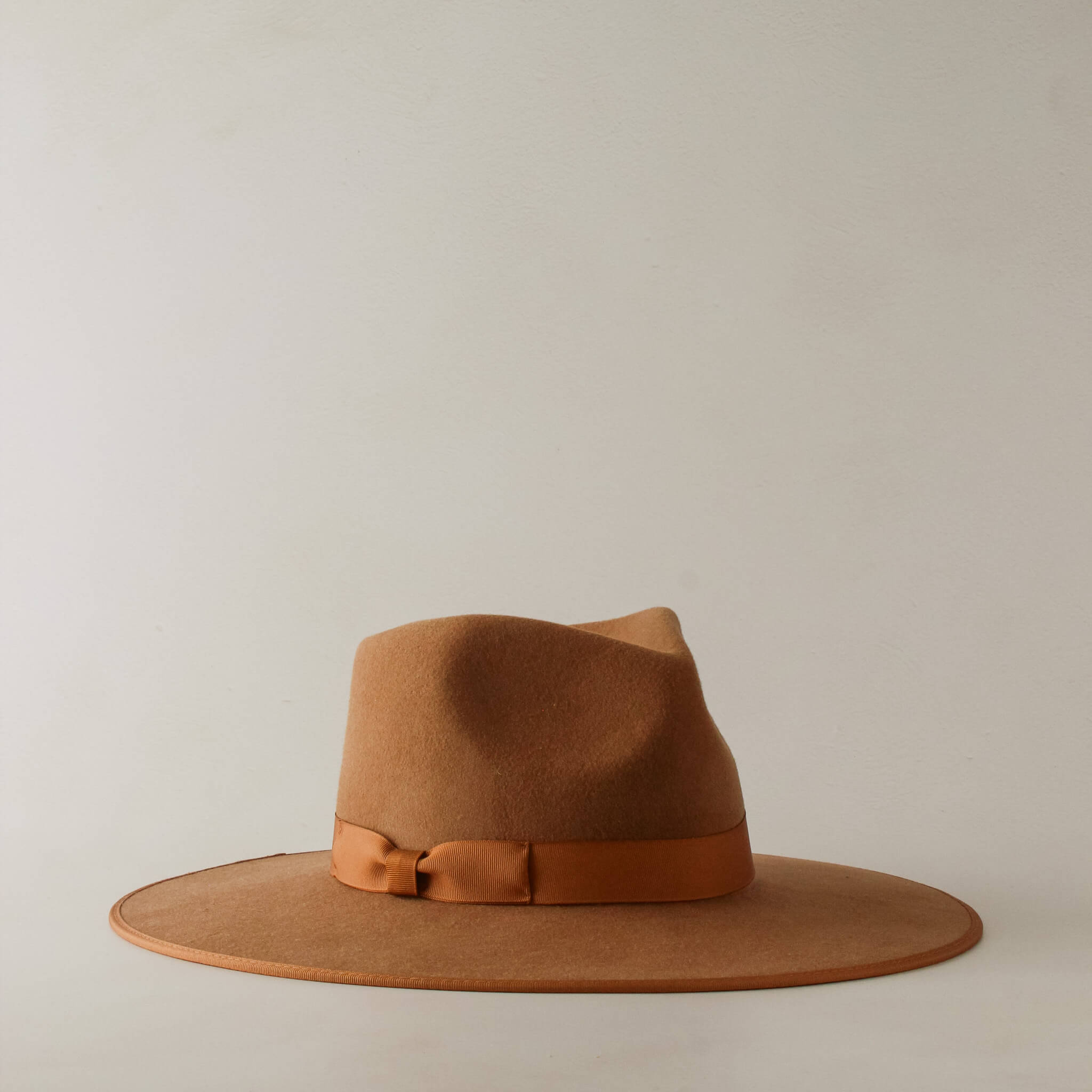 A stiffened wool fedora with a rigid crown design; the Teak Rancher is made of light brown wool with a coordinating gross grain edged hat rim & bow ribbon detail.