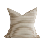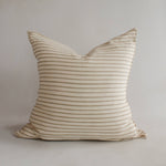 The Greige Stripe pillow is a decorative throw cushion cover that features a classic pinstripe fabric in handwoven cotton.