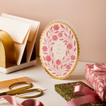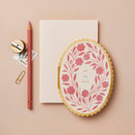 A beautiful oval card with golden scallop edging and a rose pink floral print. The floral design has a painterly quality as it's taken from an original gouache painting, and the gold foil text in the centre of the card reads 'all my love'. Paired with a complementary blush pink envelope. Packed with care from our Hove studio and printed in the UK on FSC certified papers.
